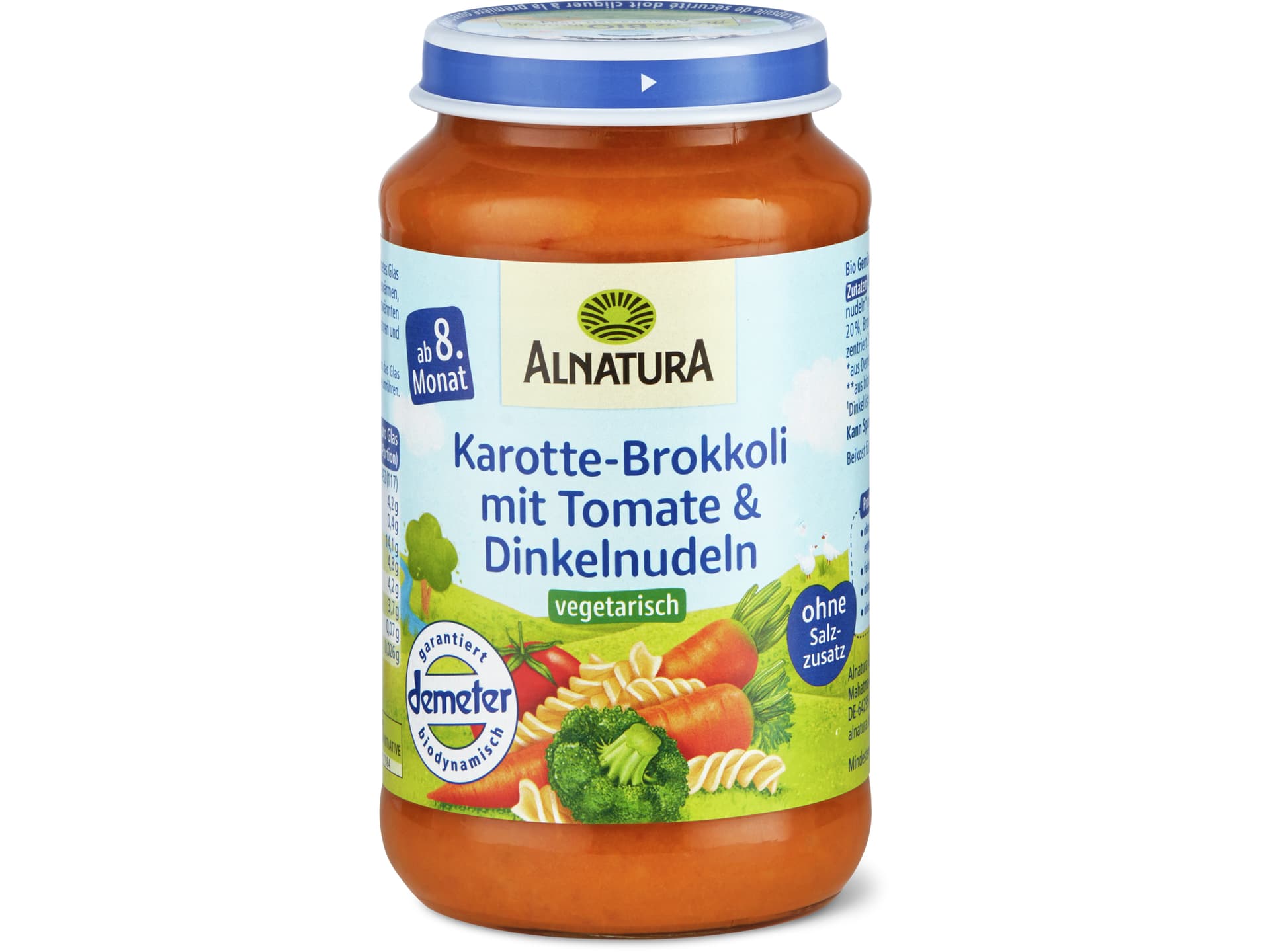 Alnatura Demeter · Детское питание в баночке с морковью, брокколи, помидорами и лапшой из полбы · С 8 месяцев