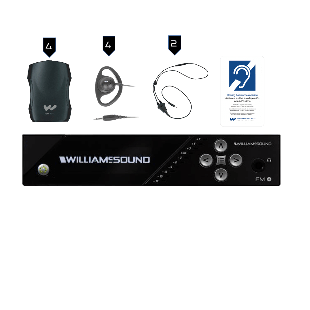 FM Plus Вспомогательная система прослушивания Dual FM и Wi-Fi большой площади с 4 приемниками FM R37. В состав системы входят: (1) передатчик FM T55, (4) приемники PPA R37N, (4) наушники объемного звучания EAR 022, (2) шейные петли NKL 001 и (1) настенная табличка IDP 008 ADA.
